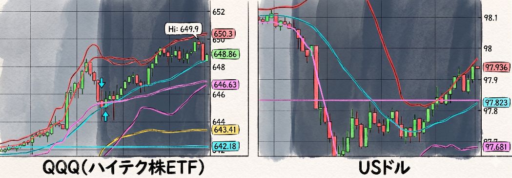 以下はある期間のドルとQQQのチャートです。